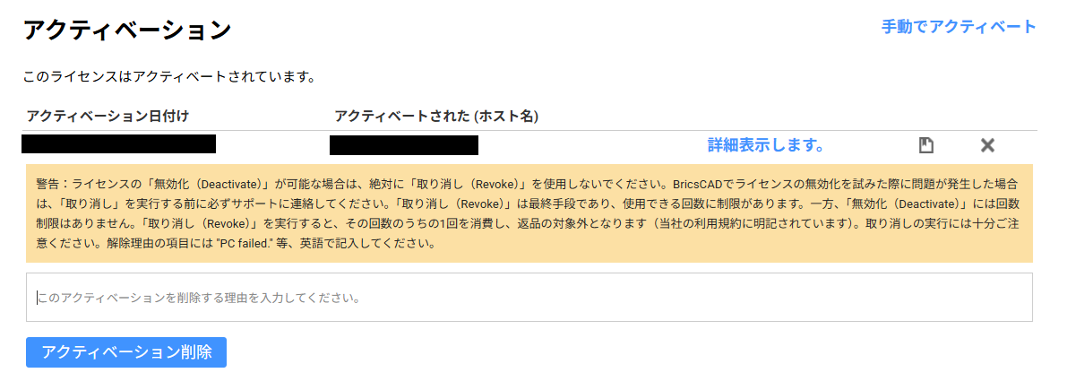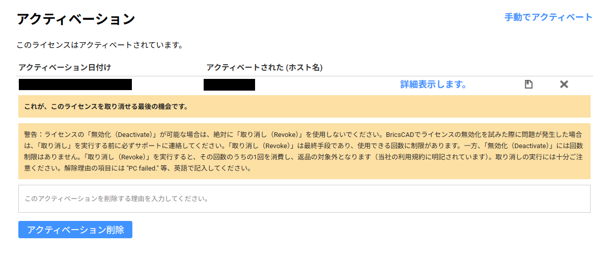 警告:ライセンスの「無効化(Deactivate)」が可能な場合は、絶対に「取り消し(Revoke)」を使用しないでください。BricsCADでライセンスの無効化を試みた際に問題が発生した場合は、「取り消し」を実行する前に必ずサポートに連絡してください。「取り消し(Revoke)」は最終手段であり、使用できる回数に制限があります。一方、「無効化(Deactivate)」には回数制限はありません。「取り消し(Revoke)」を実行すると、その回数のうちの1回を消費し、返品の対象外となります(当社の利用規約に明記されています)。取り消しの実行には十分ご注意ください。解除理由の項目には "PC failed." 等、英語で記入してください。