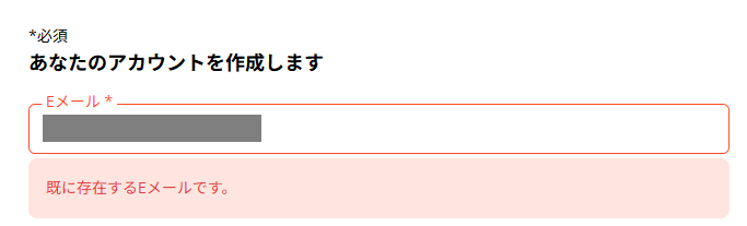 手順6で "既に存在するEメールです。" が表示される場合、該当のメールアドレスで登録が完了したアカウントが既に存在しています。