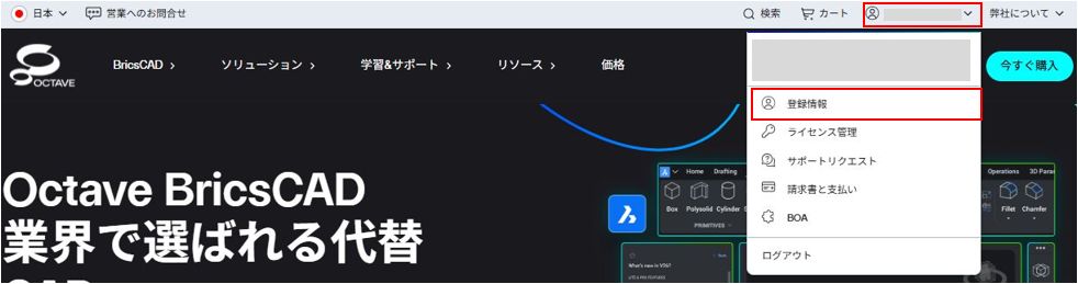 - 設定変更するアカウントでOctaveサイト(https://www.bricsys.com/ja-jp/)にログインします。