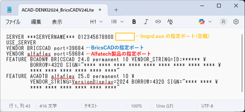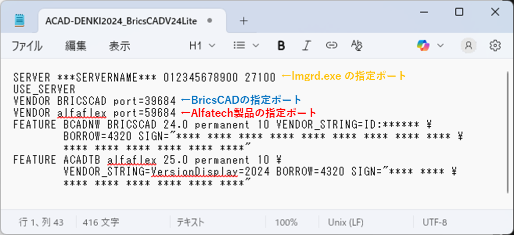 - コピーしたライセンスファイルをメモ帳等で開き、ポート指定記述を書き換えます。