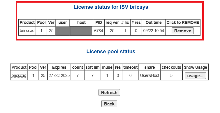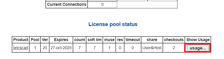 - "License statsu for ISV bricsys/alfatech"にライセンス使用数が表示されます。
