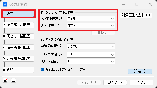 [1.設定]画面の「作成するシンボルの種別」項目にてシンボル種別を登録します。